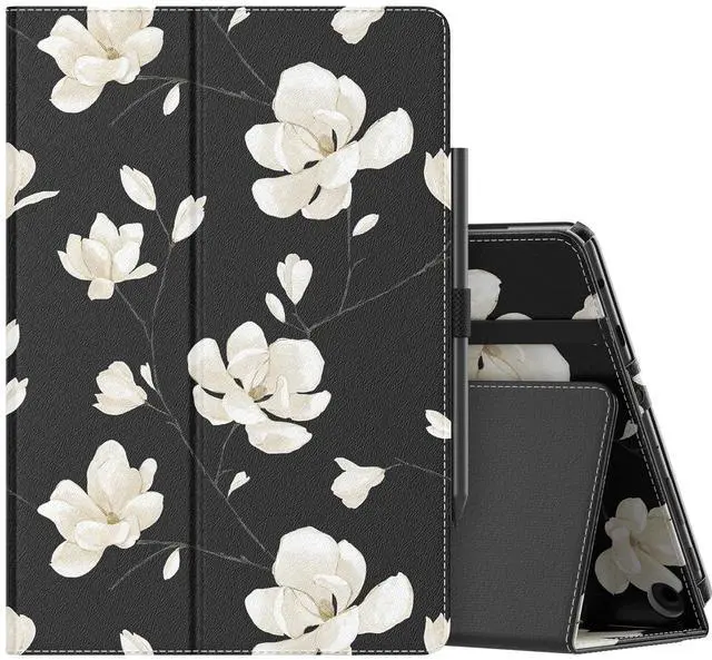 MoKo Case Fits All-New Kindle Fire HD 10 & 10 Plus Tablet (13th/11th Generation, 2023/2021 Release) 10.1" - Slim Folding Stand Cover with Auto Wake/Sleep, Black & White Magnolia