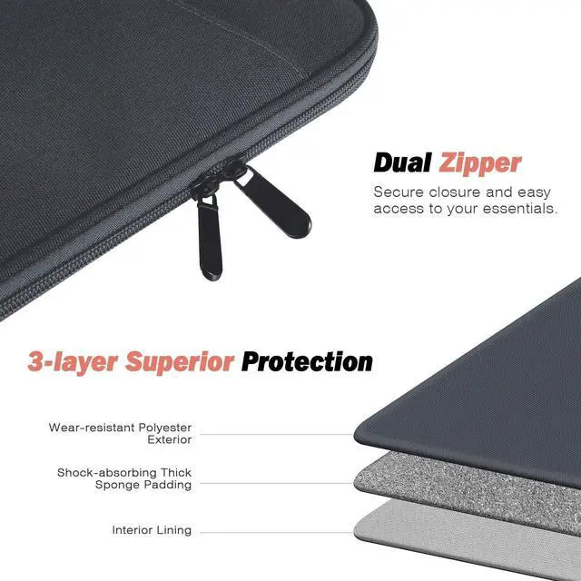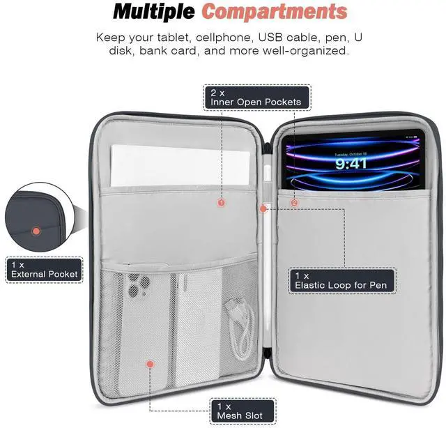 ^^ WELL-MADE - The sleeve case is made of premium polyester external, soft inner lining and thick sponge padding, which is not only splash-proof but also can protect your tablet from scratches and shocks. ^^ ENOUGH CAPACITY - There are some pockets to organize your items. A main pocket for placing your 9-11 inch tablet. And the front pocket with enough space for storing other accessories like your cellphone, chargers, USB cables, computer mouse, power bank, earphone, bank cards and other personal subjects. ^^ ZIPPER CLOSURE - Durable and smooth zipper closure make an easy access to your device and accessories.