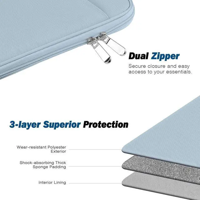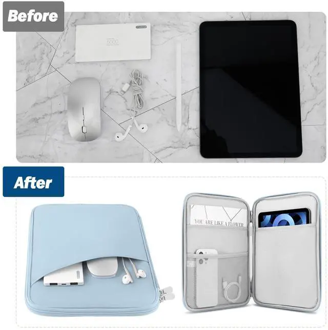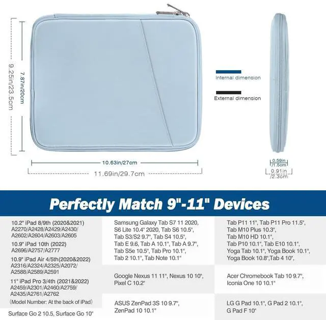 COMPATIBLE DEVICE - The sleeve bag is ideal for most 9-11 inch tablets. Fits with 11" iPad Air M3, iPad A16 2025, iPad Air 5/4th 10.9" 2022/2020, iPad Pro 11 M2/M1 2022/2021, iPad 10th 10.9 2022, iPad 9th Gen 10.2" 2021, iPad 8th/7th Gen 10.2 2020/2019, iPad Air (3rd Gen) 10.5 Inch 2019, iPad Pro 10.5 inch 2017, iPad 9.7 6th/5th Gen (2018/2017), iPad 1/2/3/4, iPad Air/Air 2, Tab S6 Lite 10.4, Galaxy Tab S8/S9 11 2022/2023, Tab A8 10.5, Surface Go 2/3 10.5, Surface Go 10 Inch 2018 Release.