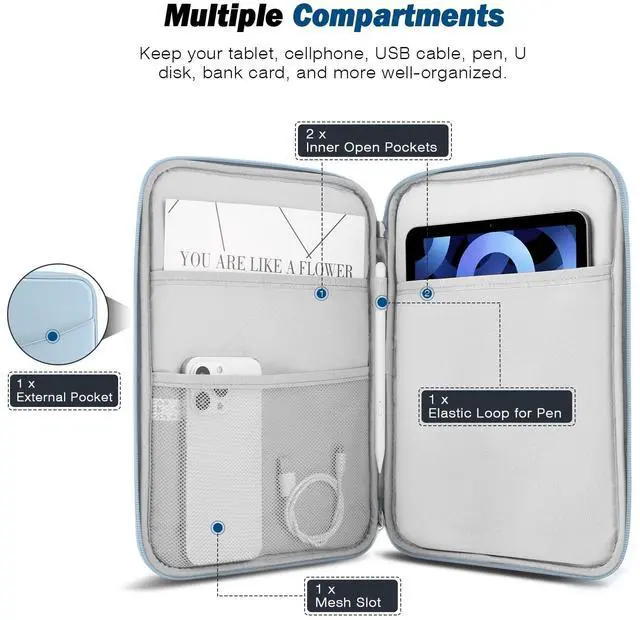 ^^ WELL-MADE - The sleeve case is made of premium polyester external, soft inner lining and thick sponge padding, which is not only splash-proof but also can protect your tablet from scratches and shocks. ^^ ENOUGH CAPACITY - There are some pockets to organize your items. A main pocket for placing your 9-11 inch tablet. And the front pocket with enough space for storing other accessories like your cellphone, chargers, USB cables, computer mouse, power bank, earphone, bank cards and other personal subjects. ^^ ZIPPER CLOSURE - Durable and smooth zipper closure make an easy access to your device and accessories.