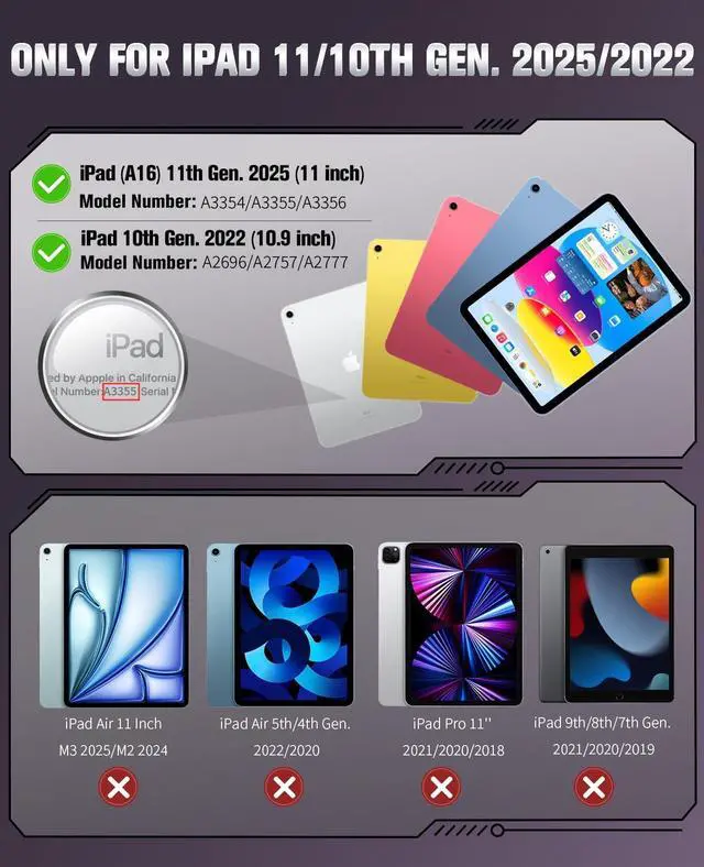 • Compatible Model Number : Designed exclusively to compatible with Apple iPad (A16) 11th Generation 2025 11 Inch (Model:A3354/A3355/A3356) or iPad 10th Generation 2022 10.9 Inch (Model: A2696/A2757/A2777)