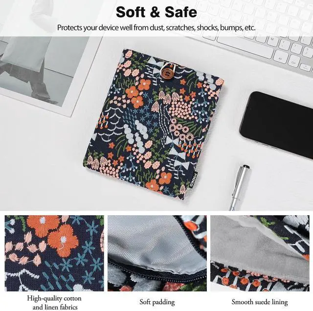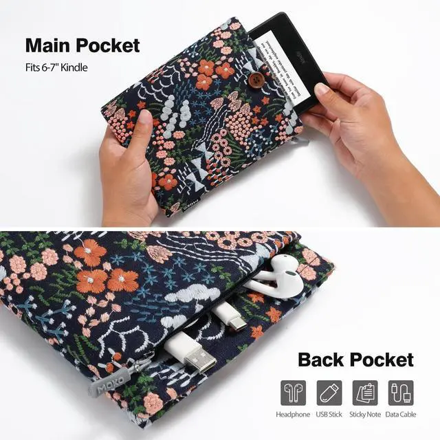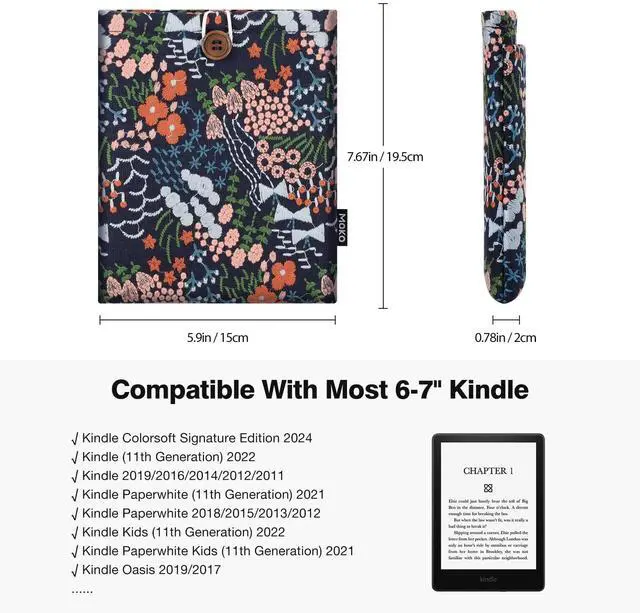 - - The protective sleeve bag is widely compatible with most 6-7 inch Kindle eReader. It fits 7" Kindle Colorsoft Signature Edition 2024, Fire 7 2022, Kindle 11th/10th/8th Gen 2022/2019/2016, Kindle 7th/5th/4th Gen 2014/2012/2011, Kindle Paperwhite 11th/10th Gen 2021/2018, Kindle Paperwhite 7th/6th/5th Gen 2015/2013/2012, Kindle Kids/Paperwhite Kids, Kindle Oasis, Kindle Voyage 2014, Kindle Touch, Kindle 4/5, Kobo Glo HD/Nook/Tolino, etc. ^^ - The two-tone kindle sleeve is embroidered with the fine bloomy daisy texture, which offers an elegant and stylish look while giving a soft touch and ensuring not easy to fade.