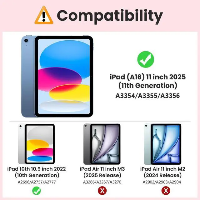 • Compatibility: Specially designed for iPad (A16) 11th generation 11-inch 2025 (Model: A3354,A3355,A3356), iPad 10th generation 10.9-inch 2022 (Model: A2696, A2757, A2777). Note: It will not be compatible with other models
