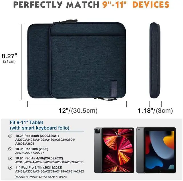COMPATIBILITY: The sleeve bag is designed for most 9-11 inch tablets and fits smart keyboard. Fit New 11-inch iPad Pro M4/iPad Air M2 2024, iPad Air 5/4th 10.9 2022/2020, iPad Pro 11 M2/M1 2022/2021, iPad 10th 10.9 2022, iPad 9/8/7th Gen 10.2 2021/2020/2019, iPad Air (3rd Gen) 10.5" 2019, iPad Pro 11" 2018-2020, iPad Pro 10.5" 2017, iPad 9.7 6th/5th Gen (2018/2017), iPad 1/2/3/4, iPad Air / Air 2, Galaxy Tab S8/S9 11", Tab S3 9.7", Surface Go 2/3 10.5", Surface Go 10" 2018 Release.