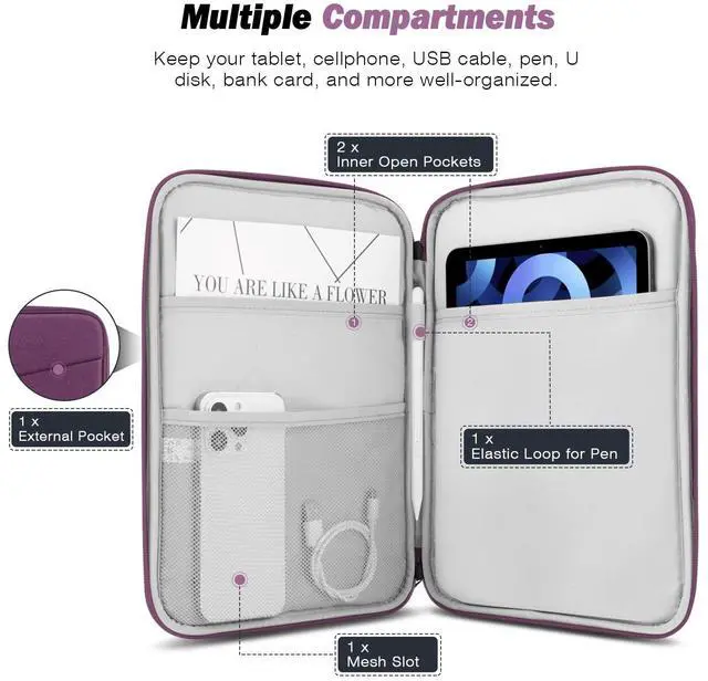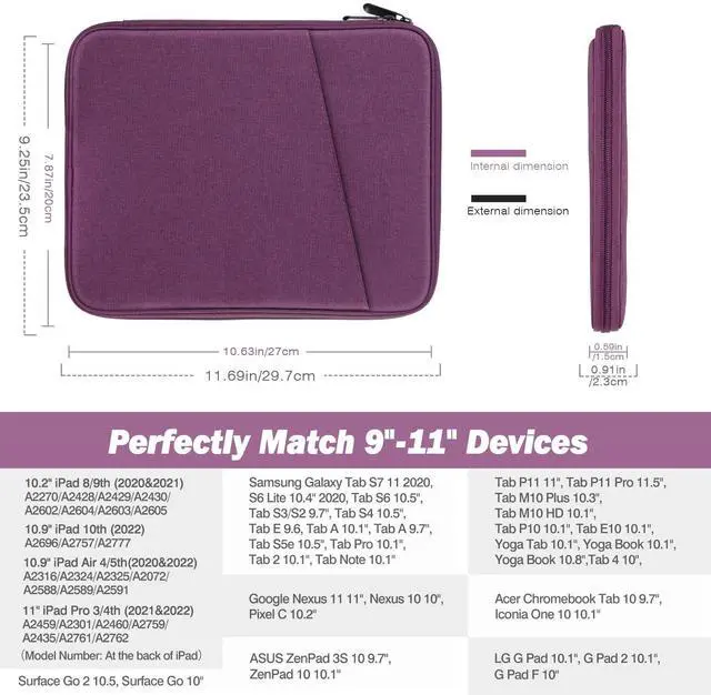 COMPATIBLE DEVICE - The sleeve bag is ideal for most 9-11 inch tablets. Fits with 11" iPad Air M3, iPad A16 2025, New 11iPad Pro M4/iPad Air M2 2024, iPad Air 5/4th 10.9" 2022/2020, iPad Pro 11 M2/M1 2022/2021, iPad 10th 10.9 2022, iPad 9th Gen 10.2" 2021, iPad 8th/7th Gen 10.2 2020/2019, iPad Air (3rd Gen) 10.5 Inch 2019, iPad Pro 10.5 inch 2017, iPad 9.7 6th/5th Gen (2018/2017), iPad 1/2/3/4, iPad Air/Air 2, Tab S6 Lite 10.4, Galaxy Tab S8/S9 11", Tab A8 10.5, Surface Go 2/3 10.5.