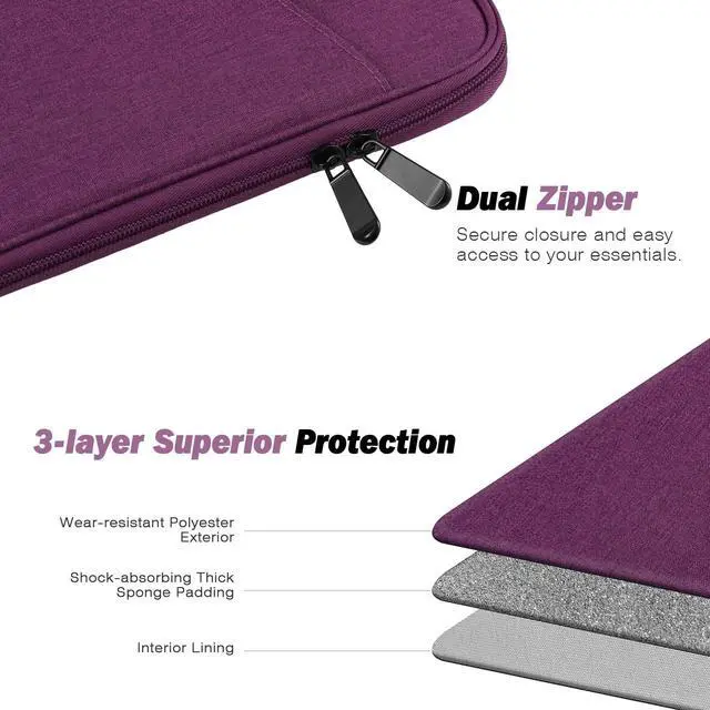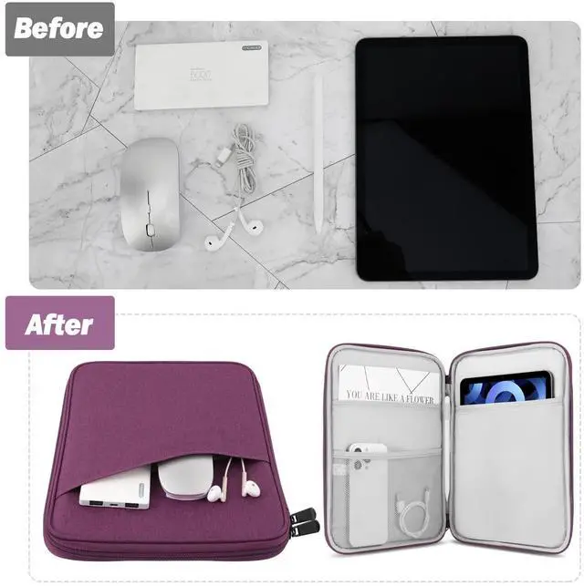^^ WELL-MADE - The sleeve case is made of premium polyester external, soft inner lining and thick sponge padding, which is not only splash-proof but also can protect your tablet from scratches and shocks. ^^ ENOUGH CAPACITY - There are some pockets to organize your items. A main pocket for placing your 9-11 inch tablet. And the front pocket with enough space for storing other accessories like your cellphone, chargers, USB cables, computer mouse, power bank, earphone, bank cards and other personal subjects. ^^ ZIPPER CLOSURE - Durable and smooth zipper closure make an easy access to your device and accessories.