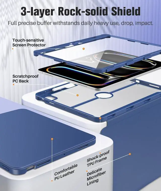 • Drop Absorption: iPad Pro 13 Inch 2025 Case with transparent hard PC back plate and flexible TPU shock absorbing frame, enhances drop protection to withstand daily drops, bumps and shocks. PU leather exterior and soft microfiber lining protect the iPad Pro 13 inch 2025 from dust, fingerprints and scratches