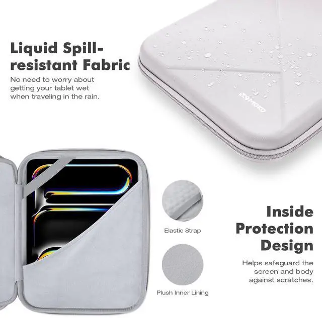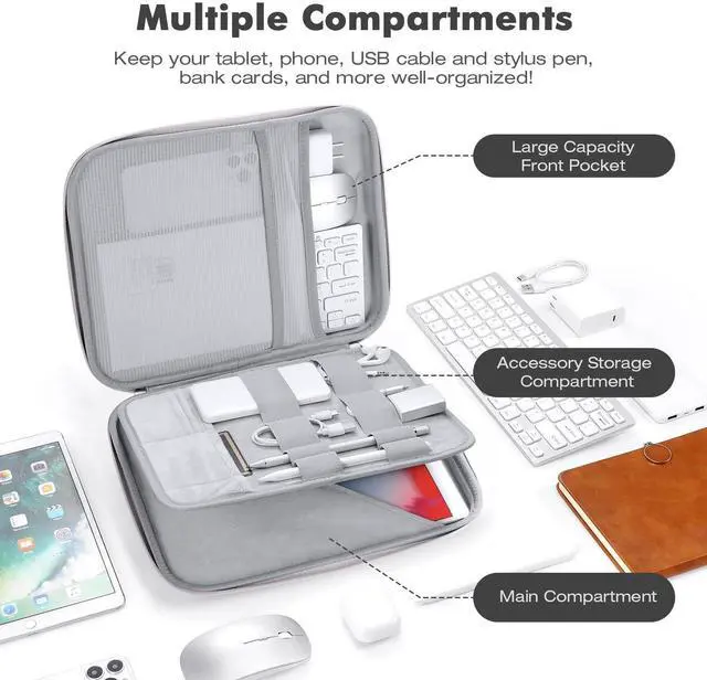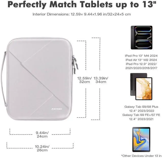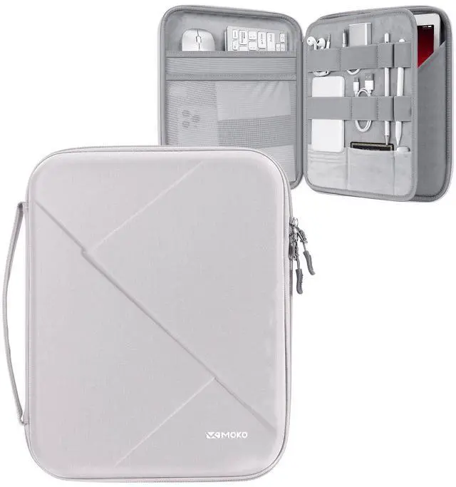 MoKo tablet sleeve bag for tablets 12.9 inches and belowAdvantages: Large capacity-The tablet bag is compatible with tablets 12.9 inches and below. There are three levels of storage space to store the tablet and all accessories, such as a smart keyboard, headphones, charging cables, bank cards and more. Drop-proof-The hard EVA shell prevents the tablet from breaking; the tablet sleeve bag carrying is specially designed with bumps to cushion the impact when it is dropped; the tablet pocket also comes with an elastic strap to prevent iPad from sliding side-to-side in case the tablet falls out of the bag when it's opened. Protection-The soft suede lining of the tablet protective bag does not easy to scratch the tablet; the splash-resistant fabric protects the tablet from getting wet even on rainy days. Exquisite appearance-The geometric lines of the tablet sleeve bag case are matched with the black exterior, which makes it look elegant; the padded handle is soft and comfortable, and even if you carry it for a long time, you won't feel any pain in your hand.