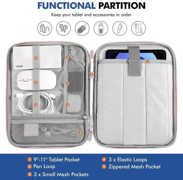 ^^ Meet Storage Needs- There are classified pockets for your devices and related accessries, whose pockects include 9"-11" tablet pocket, pen loop, 3 x small mesh pockets, 3 x elastic loops and a zipped mesh pocket. The tablet sleeve with handle can keep your tablet and accessories in order. ^^ Excellent Protection- With 3-layer material structure with protection features of splash-resistant polyester exterior, shock-absorbing pearl cotton Interlayer and wear-resistant interior lining, this tablet sleeve bag can protect your devices and other items from dust, scratches and shocks. ^^ Easy to Access & Carry- With two-way zipper, it can offer a full 180 opening for convenient access to your device.