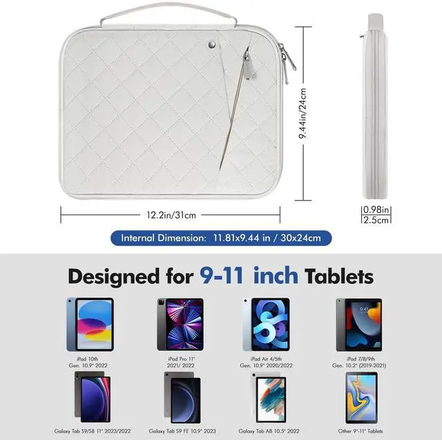 Sleeve: The tablet carrying bag is designed specially for 9-11 inch tablets, such as New 11-inch iPad Pro M5 2025, New 11-inch iPad Air M3 2025, New iPad (A16) 2025, iPad Pro 11 M4 2018-2024, iPad 10th Gen. 10.9", iPad Air 4/5th Gen. 10.9", iPad 7/8/9th Gen. 10.2" (2019-2021), iPad Air/iPad Pro 10.5" / 9.7", New Galaxy Tab S9/S8 11" 2023/2022, Galaxy Tab S9 FE 10.9" 2023, Galaxy Tab A8 10.5" 2022, Galaxy S7/A9+/A8/A7, Surface Go 2/3th 10.5" and other 9"-11" tablets.