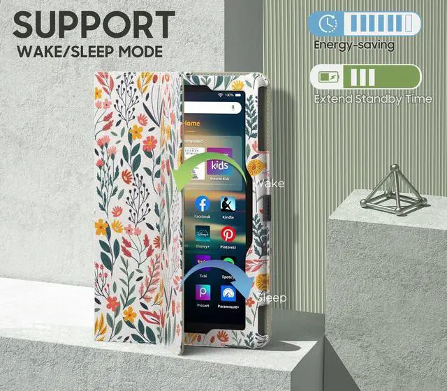 ^^ Auto Wake/Sleep: Built-in magnetic strip, automatically wakes or puts your Kindle fire 8 tablet 2022 to sleep when the lid is opened and closed. Protects and extends battery life.