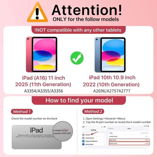 Compatibility: Specifically designed for the iPad (A16) 11th Generaion 11 Inch 2025 (Model: A3354, A3355, A3356), iPad 10th Generation 10.9 inch 2022 (Model: A2696, A2757, A2777). This case is not compatible with any other devices. Please verify your iPad's model number located on the back of the device before purchasing