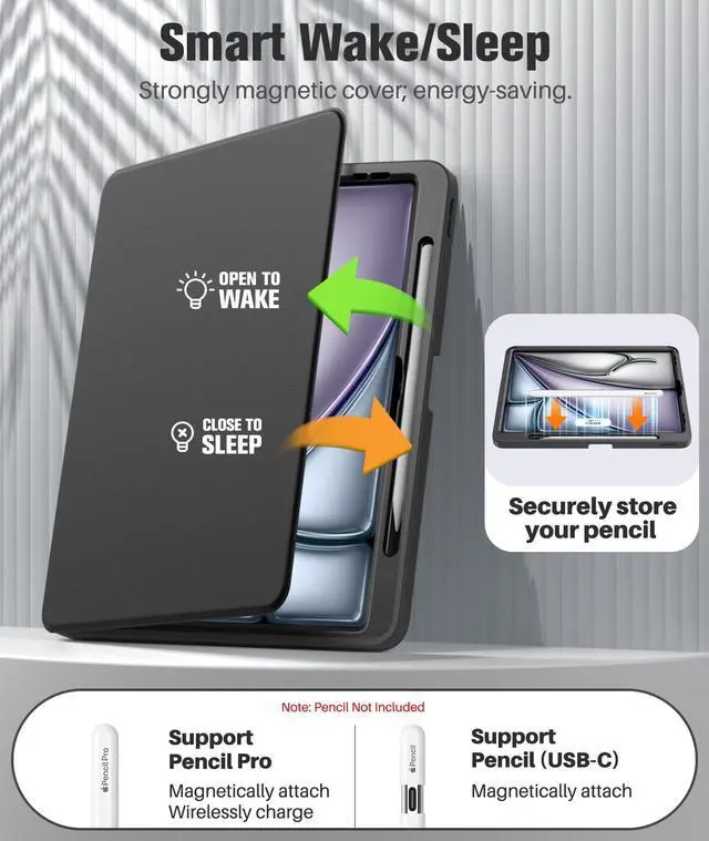 Pencil Holder: iPad Air 13 Case built-in full HD premium screen protector can protect the screen and maintain a good touch sensitivity. The pencil holder keeps your Apple Pencil Pro and USB-C within easy reach and prevents loss, Only supports Apple Pencil Pro wireless charging.