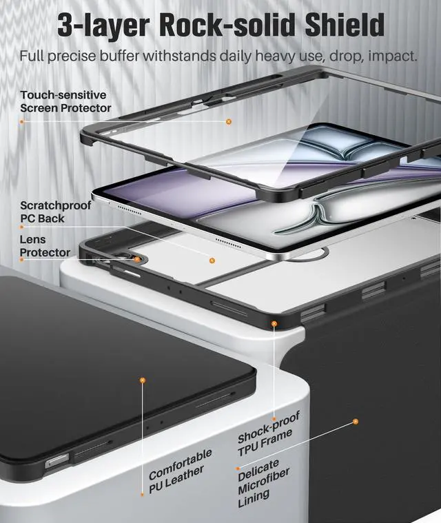 Drop Absorption: iPad Air 13 Inch 2025 Case with transparent hard PC back plate and flexible TPU shock absorbing frame, enhances drop protection to withstand daily drops, bumps and shocks. PU leather exterior and soft microfiber lining protect the iPad air 13 inch 2025 from dust, fingerprints and scratches ^^ Screen Protector and