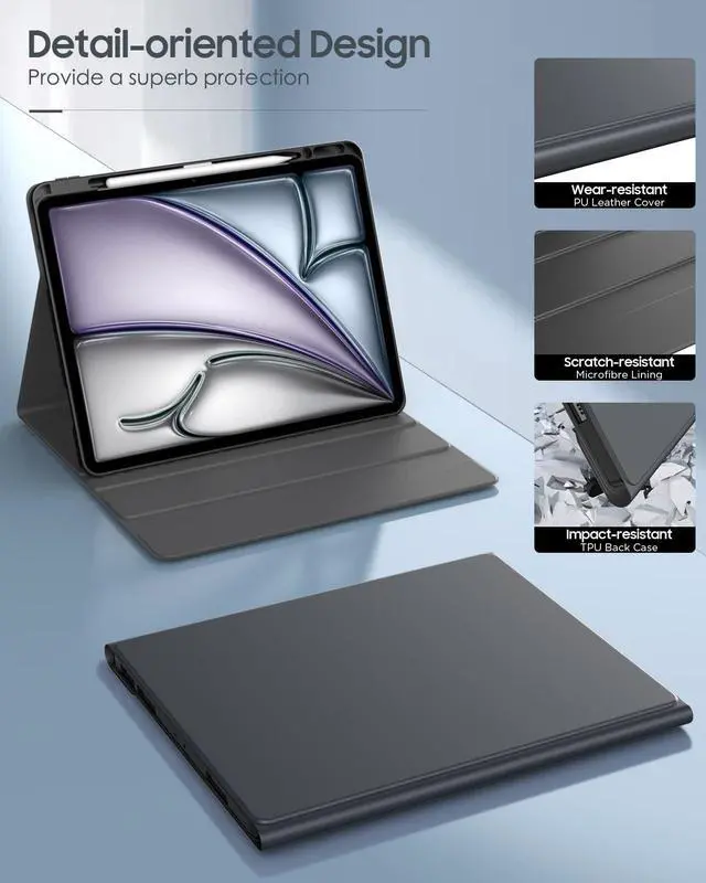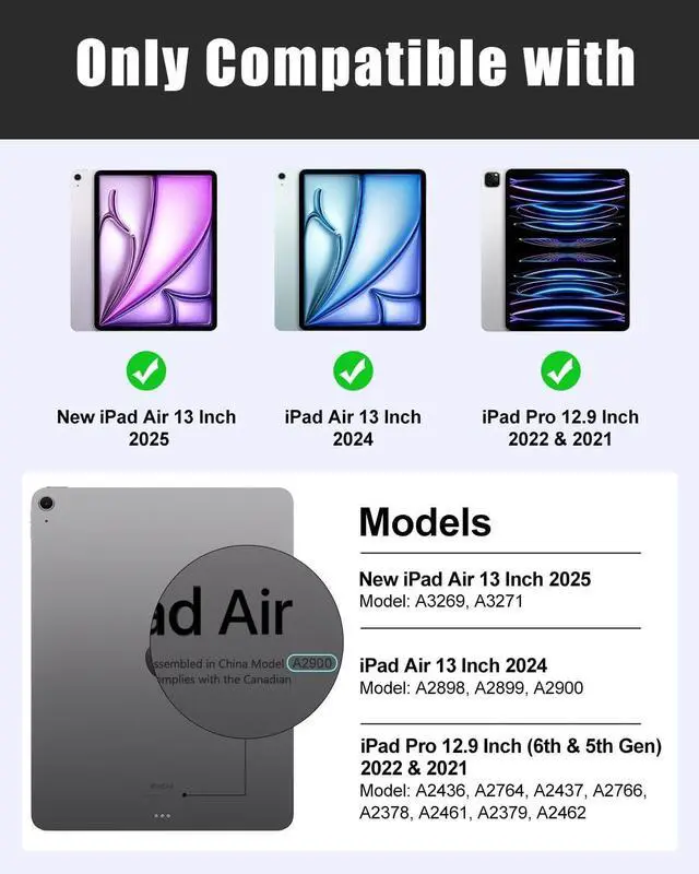[Compatibility] Moko Keyboard Case specially for iPad Air 13-inch M3 2025 (A3268/A3269/A3271), for iPad Air 13-inch M2 2024 (A2898/A2899/A2900), for iPad Pro 12.9 inch 6th Gen 2022 (A2436/A2437/A2764/A2766), for Pro 12.9 5th Generation 2021 (A2378/A2379/A2461/A2462), for Pro 12.9 4th Gen 2020 (A2229/A2069/A2232/A2233), for Pro 12.9 inch 3rd Gen 2018 (A1876/A1895/A1983/A2014). Please check the model number starting with "A" on the back of your tablet before purchasing ^^ [Magnetic Detachable Keyboard] Switch effortlessly between a laptop-like experience with keyboard case for iPad air 13 inch and a tablet. Ultra-strong magnets seamlessly combine for iPad 12.9 case with keyboard that provide more convenience while typing that can be attached to the case and easy removal when you need it, perfect for both stationary work and on-the-go use.