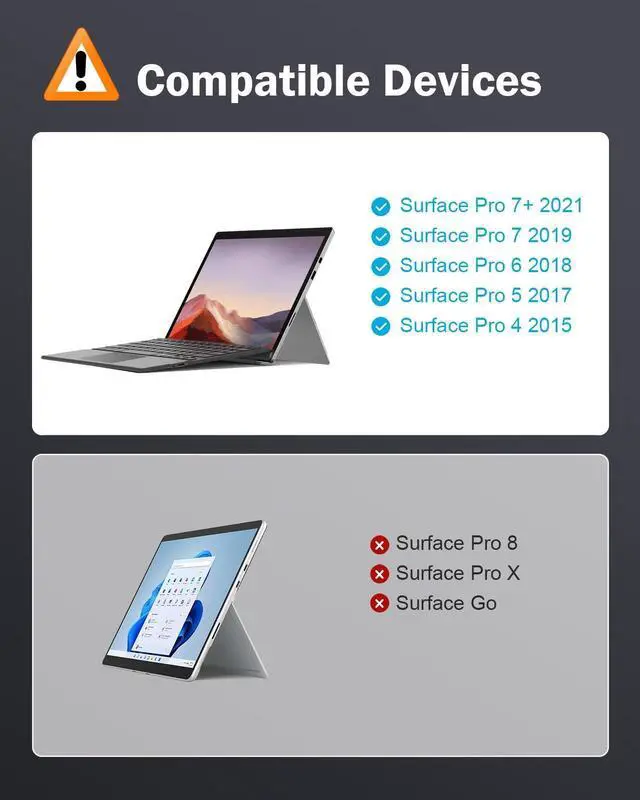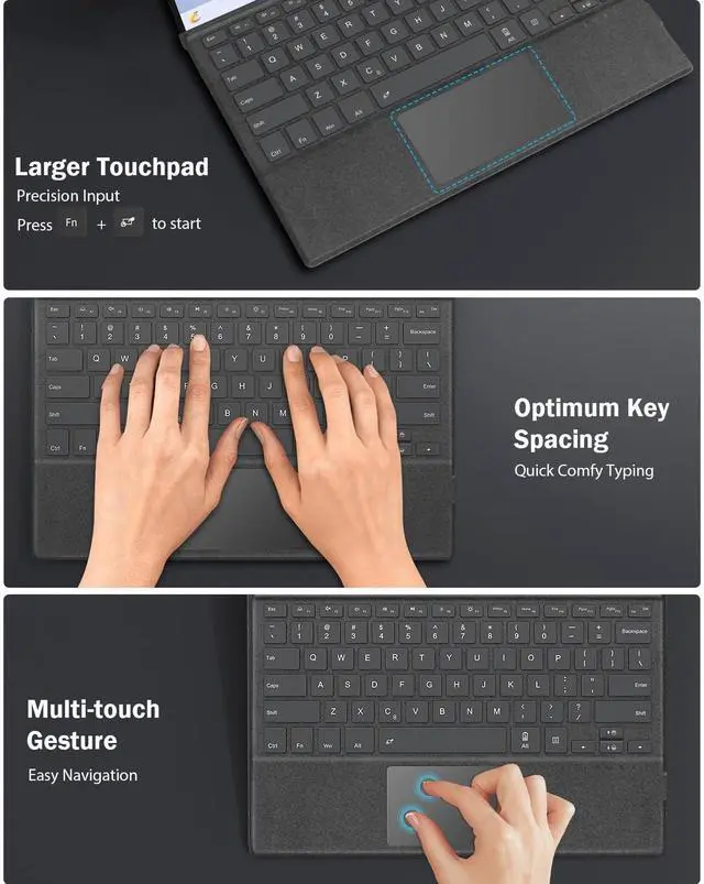 COMPATIBILITY: Wireless Keyboard for Microsoft Surface Pro 7 Plus (2021) / Pro 7 (2019) / Pro 6 / Surface Pro 5 (Pro 2017) / Pro 4 / Pro 3 (Not fit for surface 3). with slightly spread out keys for a more familiar and efficient typing experience that feels like a traditional laptop. The keyboard is sturdy with enhanced magnetic stability along the fold so you can adjust it to the right angle and work on your lap, on the plane, or at your desk. (This is QWERTY Keyboard for English systems only. )