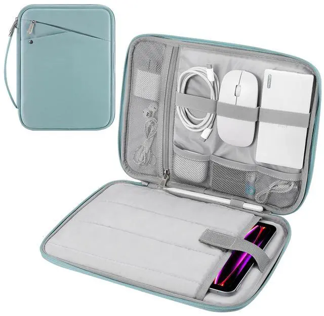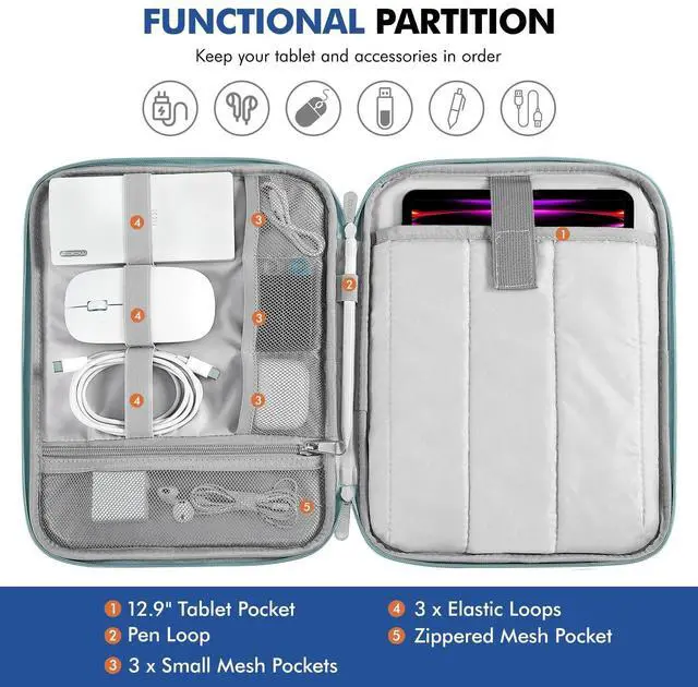 Universal iPad Sleeve- The tablet carrying bag is designed specially for 13 inch tablets, such as New 13-inch iPad Pro M5/iPad Air M3 2025, 13-inch iPad Pro M4 2024, 13-inch iPad Air M2 2024, iPad Pro 12.9 2024/2022/2021/2020/2018, iPad Air 12.9 2024, Galaxy Tab S9/S8 Plus 12.4" 2023/2022, Galaxy Tab S9/S7 FE+ 12.4" 2023/2021, Surface Laptop Go 12.4" 2022, and other 13" tablets. ^^ Meet Storage Needs- There are classified pockets for your devices and related accessries, whose pockects include 12.9" tablet pocket, pen loop, 3 x small mesh pockets, 3 x elastic loops and a zipped mesh pocket.