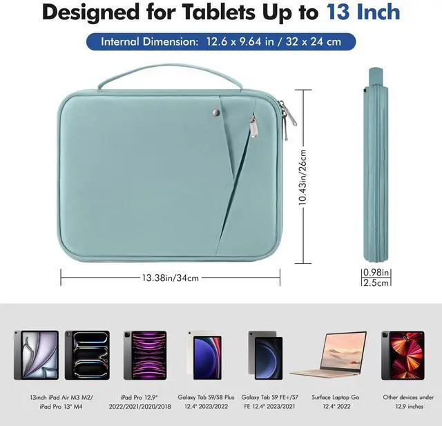 • Universal iPad Sleeve- The tablet carrying bag is designed specially for 13 inch tablets, such as New 13-inch iPad Pro M5/iPad Air M3 2025, 13-inch iPad Pro M4 2024, 13-inch iPad Air M2 2024, iPad Pro 12.9 2024/2022/2021/2020/2018, iPad Air 12.9 2024, Galaxy Tab S9/S8 Plus 12.4" 2023/2022, Galaxy Tab S9/S7 FE+ 12.4" 2023/2021, Surface Laptop Go 12.4" 2022, and other 13" tablets.