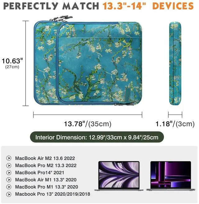 COMPATIBILITY: The sleeve bag is for devices 13.3 -14 inch and fits smart keyboard. Fits with New MacBook Pro M3/M3 PRO/M3 MAX 2023, Macbook Pro 14" M2 2023, Macbook Pro 13" M2 2022/Pro M1 Pro/M1 Max 14.2 2021 Macbook Air 13.6" M2 2022/Air 13.3 2019/2020/Pro 13.3 2020, iPad Pro 12.9 M2/M1 2022/2021/2020 (with smart keyboard folio), Galaxy Tab S8+ 12.4", 13" Surface Pro 9 2022, Surface Pro 8, Chromebook Flex 5 13"/Spin 13, Surface Laptop Go 12.4", Surface Pro X/3/4/5/6/7, Surface Book 3.