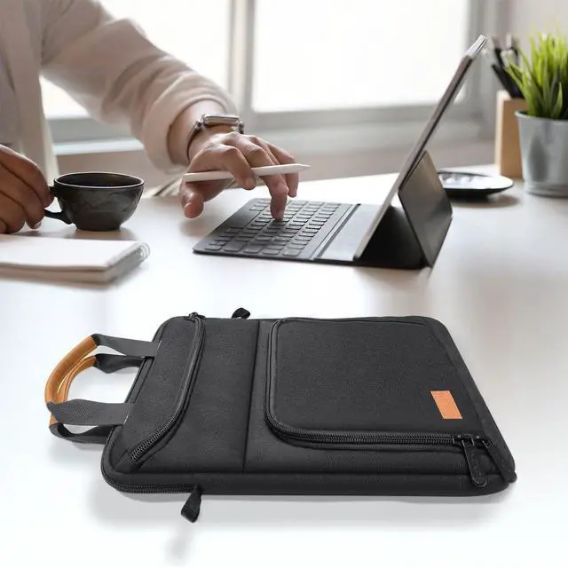 Comes with multiple compartments: 1 x main compartment to keep your tablet, 1 x magnetic back pockets to store your keyboard, 2 x front pockets with zipper offering enough space for your accessories like pens, cables, mouse, earphone, notes, wallet, cards and more small items. Keep your items well organized, and easily find the thing you need. ^^ Thoughtful Design and Convenient - With the concealable grip and detachable adjustable shoulder strap, this tablet sleeve can be used as a handbag, crossbody bag and single-shoulder bag. Slim and lightweight, easy to carry around. ^^ Dimensions & Portable -