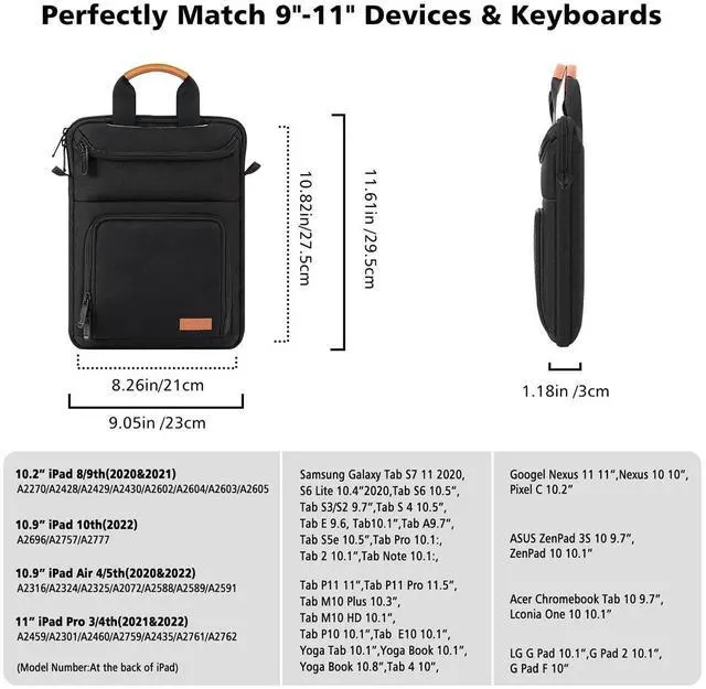 Compatible Device - The ipad sleeve bag perfectly fits 9-11 inch devices, compatible with New 11-inch iPad Pro M4/iPad Air M2 2024, iPad Air 5/4th 10.9, iPad Pro 11 M2/M1, iPad 10th Generation 10.9, iPad 9/8/7th Gen 10.2, iPad Air (3rd Gen) 10.5", iPad Pro 11" 2018-2020, iPad Pro 10.5" 2017, iPad 9.7 6th/5th Gen (2018/2017), iPad 1/2/3/4, iPad Air / Air 2, New Galaxy Tab S8/S9 11 2022/2023 / Tab A7 10.4 / Tab A8 10.5 / Tab S6 Lite 10.4, Surface Go 3/2 10.5", Surface Go 10" 2018 Release, etc.