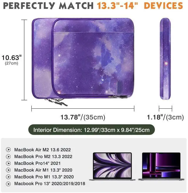 COMPATIBILITY: The sleeve bag is for devices 13.3 -14 inch and fits smart keyboard. Fits with New MacBook Pro M3/M3 PRO/M3 MAX 2023, Macbook Pro 14" M2 2023, Macbook Pro 13" M2 2022/Pro M1 Pro/M1 Max 14.2 2021 Macbook Air 13.6" M2 2022/Air 13.3 2019/2020/Pro 13.3 2020, iPad Pro 12.9 M2/M1 2022/2021/2020 (with smart keyboard folio), Galaxy Tab S8+ 12.4", 13" Surface Pro 9 2022, Surface Pro 8, Chromebook Flex 5 13"/Spin 13, Surface Laptop Go 12.4", Surface Pro X/3/4/5/6/7, Surface Book 3.