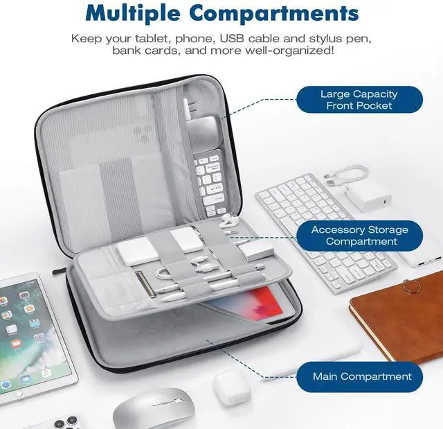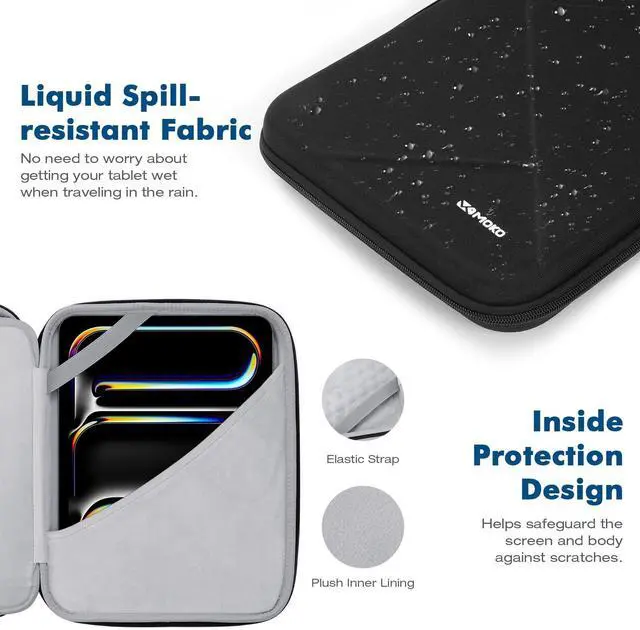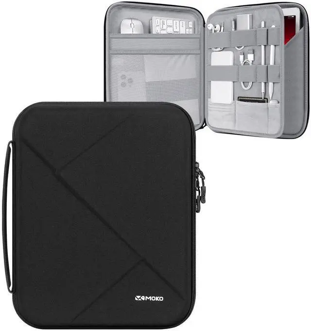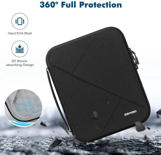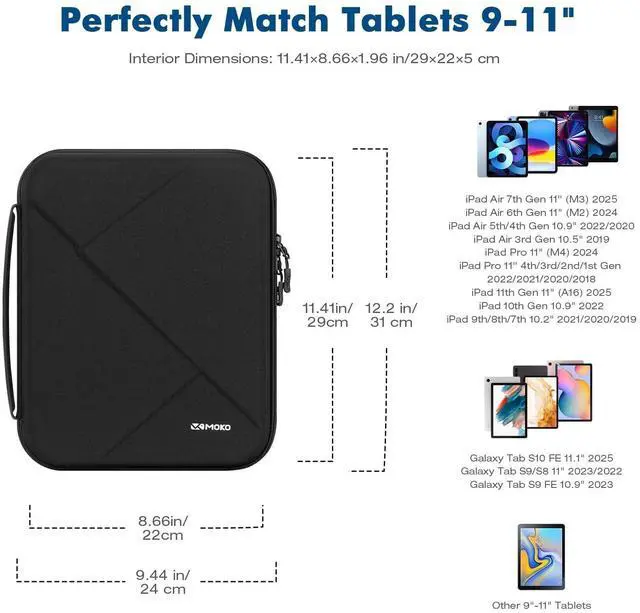 CompatibilityThe sleeve bag fits most 9-11 inch tablet. Fits New 11-inch iPad Air M3/iPad A16/iPad Pro M5 2025, 11-inch iPad Air M2/ iPad Pro 11 M4 2024, iPad Air 5/4th 10.9, iPad 10th 10.9, iPad 9/8/7th Gen 10.2, iPad Air (3rd Gen) 10.5 Inch 2019, iPad Pro 11 2018-2020, iPad Pro 10.5 2017, Surface Go 2/3 10.5", Galaxy Tab S10 FE/S9 FE 10.9", Galaxy Tab S8/S9/A9+/A9 Plus 11", Tab S6 Lite 10.4", Tab A8 10.5". ^^ Excellent ProtectionThis tablet sleeve's tough EVA shell with soft lining protects tablet and accessories from drops and scratches; liquid spill-resistant fabric prevents the ipad sleeve 9-11 inch from getting wet even when it rains; tablet pocket is specially designed with bump cushioning and elastic strap to minimize impact when the bag is dropped, and elastic strap prevents the iPad from sliding side to side.