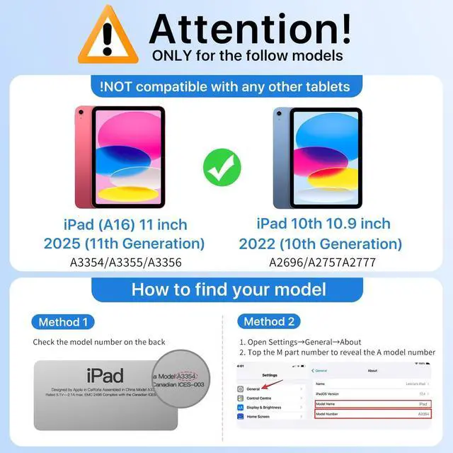• Compatibility: Specifically designed for the iPad (A16) 11th Generaion 11 Inch 2025 (Model: A3354, A3355, A3356), iPad 10th Generation 10.9 inch 2022 (Model: A2696, A2757, A2777). This case is not compatible with any other devices. Please verify your iPad's model number located on the back of the device before purchasing
