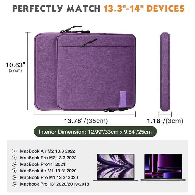 COMPATIBILITY: The sleeve bag is for devices 13.3 -14 inch and fits smart keyboard. Fits with New MacBook Pro M3/M3 PRO/M3 MAX 2023, Macbook Pro 14" M2 2023, Macbook Pro 13" M2 2022/Pro M1 Pro/M1 Max 14.2 2021 Macbook Air 13.6" M2 2022/Air 13.3 2019/2020/Pro 13.3 2020, iPad Pro 12.9 M2/M1 2022/2021/2020 (with smart keyboard folio), Galaxy Tab S8+ 12.4", 13" Surface Pro 9 2022, Surface Pro 8, Chromebook Flex 5 13"/Spin 13, Surface Laptop Go 12.4", Surface Pro X/3/4/5/6/7, Surface Book 3.
