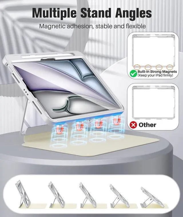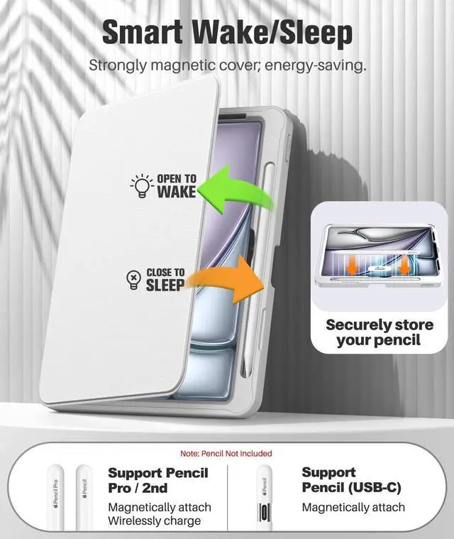 Product Features: 1. The full ipad air 11 inch case is crafted from premium materials to effectively prevent scratches and impacts. 2. The strong magnetic stand provides stable support for daily use, meeting needs for watching videos, studying, or typing. 3. The ipad air m3 11 inch case with screen protector delivers high clarity, safeguarding your device's screen while ensuring responsive touch and uninterrupted use. 4. The ipad air 11 case with pencil holder conveniently stores your stylus, preventing loss and enabling effortless use anytime, anywhere.