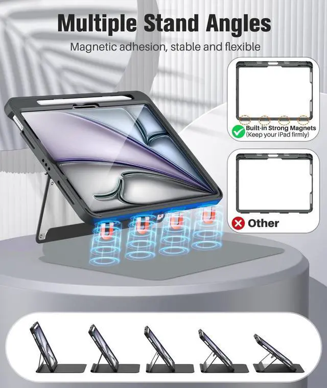 Product Features: 1. The full ipad air 11 inch case is crafted from premium materials to effectively prevent scratches and impacts. 2. The strong magnetic stand provides stable support for daily use, meeting needs for watching videos, studying, or typing. 3. The ipad air m3 11 inch case with screen protector delivers high clarity, safeguarding your device's screen while ensuring responsive touch and uninterrupted use. 4. The ipad air 11 case with pencil holder conveniently stores your stylus, preventing loss and enabling effortless use anytime, anywhere.