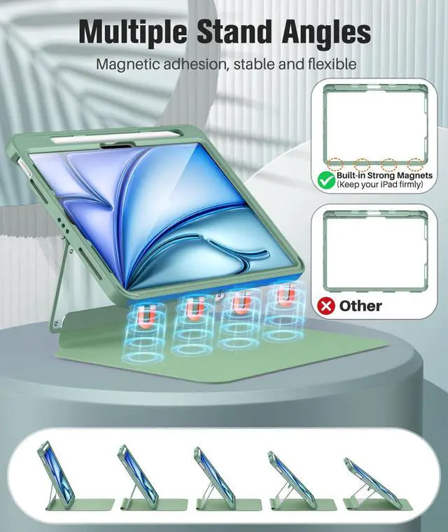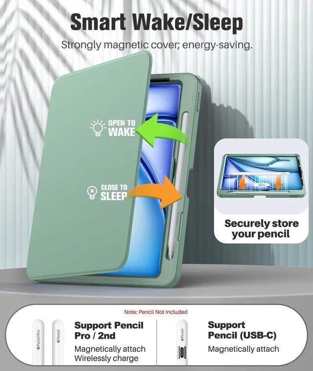 Product Features: 1. The full ipad air 11 inch case is crafted from premium materials to effectively prevent scratches and impacts. 2. The strong magnetic stand provides stable support for daily use, meeting needs for watching videos, studying, or typing. 3. The ipad air m3 11 inch case with screen protector delivers high clarity, safeguarding your device's screen while ensuring responsive touch and uninterrupted use. 4. The ipad air 11 case with pencil holder conveniently stores your stylus, preventing loss and enabling effortless use anytime, anywhere.