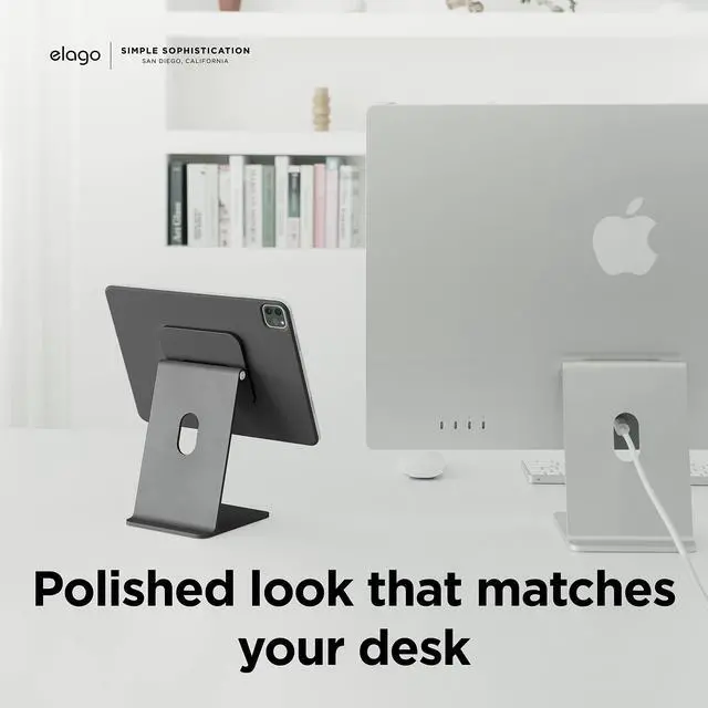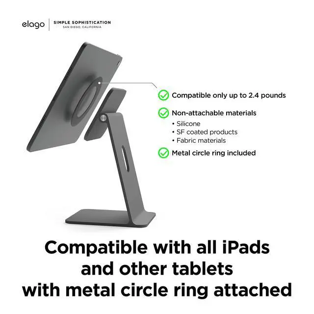 elago Magnetic Folio case sold separately. If you don't have an elago magnetic folio case, USE THE RING. Ring is INCLUDED. ^^ STRONG MAGNETS KEEP YOUR tablet in place. VIEWING ANGLE IS ADJUSTABLE to optimize your work space and allows you to place the stand at various levels on your desk. CABLE MANAGEMENT HOLE on the stand allows you to keep all cables going to and from the tablet in one area. ^^ PERFECT GIFT FOR anyone in need of a stand compatible with iPad! Great for BIRTHDAY PRESENTS for loved ones and gifts during the holiday season ESPECIALLY CHRISTMAS FOR STOCKING STUFFERS! ^^ elago is a DESIGN COMPANY FIRST AND FOREMOST.