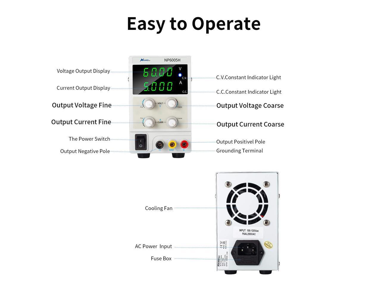 - HHIGH QUALITY AND SAFETY: High quality circuit board made, and make the variable power supply stable output. It's built-in cooling fan with thermo-sensor and two heat sinks used will keep the 60volt 5amp dc bench power supply cool,noise reduced and life prolonged. It's set anti-reverse connectio
