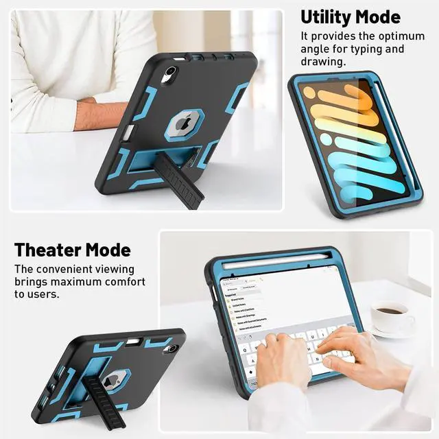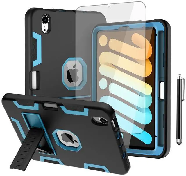 AICase iPad mini 6 (2021) with Screen Protector, Kickstand Shockproof Heavy Duty Resistant Rugged Hybrid Three Layer Full Body Protection Case with Stylus (Black/Light Blue)