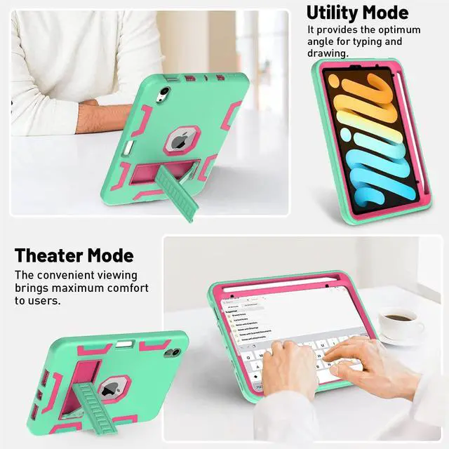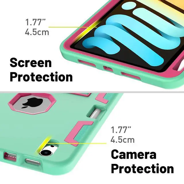 ^^ Material: Silicone and PC - Durable, Safety and Non-Toxicity, Lasting color and not easily deformed. Includes a screen protector and a capacitive stylus as a bouns) ^^ Easy to convert Kick Stand Design=Extremely Convenient and Excellent for Video and Chatting ^^ iPad Apple Pencil Holder, Support 2nd Gen Apple Pencil Charging- Built-in Pencil Holder, grab your Pencil effortlessly whenever you want, easily to carry your pencil with your iPad mini 6; Support 2nd Gen Apple Pencil Charging. ^^ Provides a perfect protection to your iPad against shocks, damages, dusts and scratches. Precise cutouts for improved access to all ports, buttons, cameras, speakers, and mics.