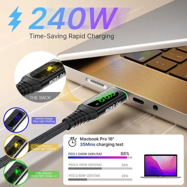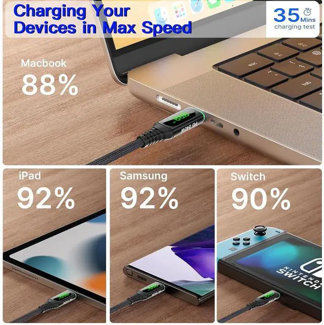 Charging Time: 240W type C to type C flash charging cable charge your devices at the fastest speed. It can fully charge a MacBook Pro 86% and an iPad Pro 89%, a Samsung S20 96%, a Switch 90% in 35 minutes.