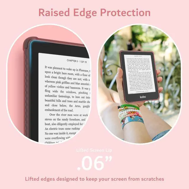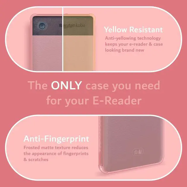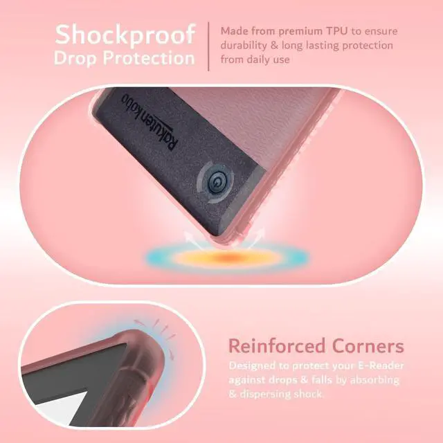 [Compatibility] Specifically designed to be compatible with Kobo Clara 2E 2022 (6") Only. Not Compatible with Kobo Clara BW/Colour (2024) Version ^^ [Shockproof] Durable TPU material with reinforced corners provide excellent shock-absorbing properties to protect against accidental drops ^^ [Enhanced Grip] Non-slip textured design on both sides provide additional grip ^^ [Lifted Edges Protection] Raised lips around the screen reduces the risk of scratches and damage ^^ [Perfect fit] Precise and accurate cutouts perfectly align with the ports and buttons of your eReader to ensure hassle-free access