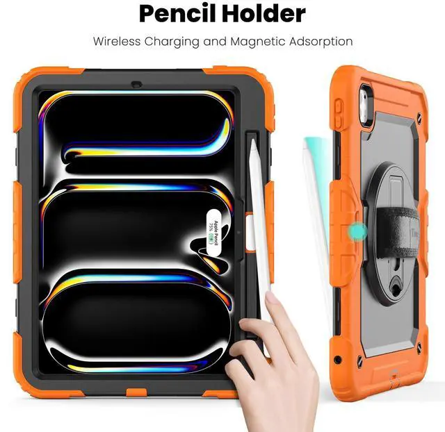 timecity for iPad Pro 11 Inch M4 Case 2024 5th Gen, 360deg Rotating Stand, Pencil Holder & Wireless Charging, Shockproof with Screen Protector & Shoulder Strap - for Designers & Professionals, Orange