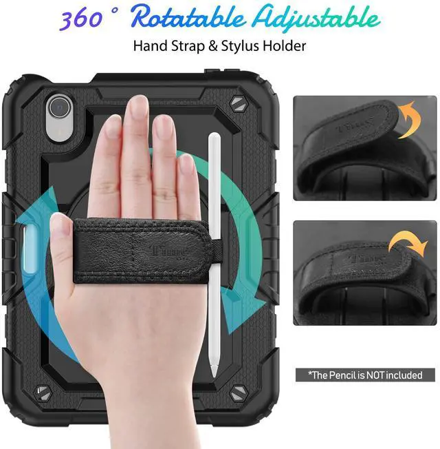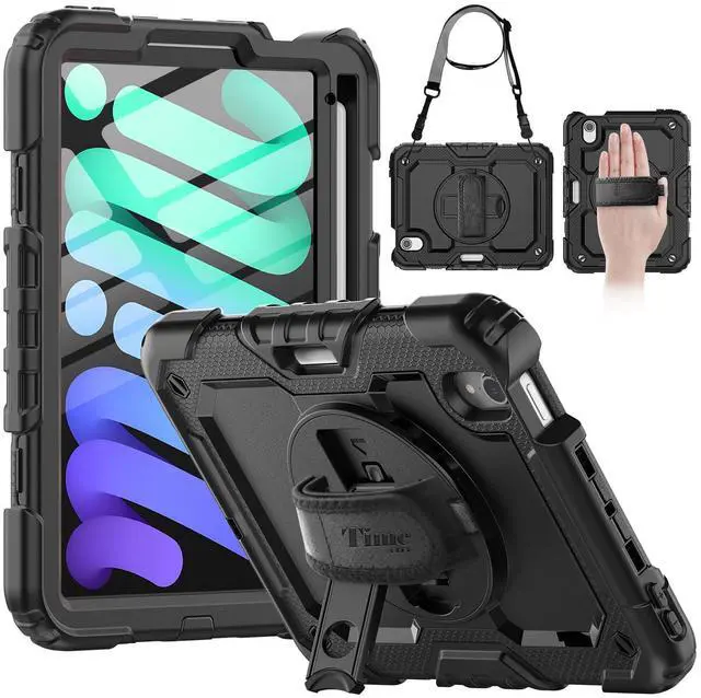 Timecity Case for iPad mini 7 (A17 Pro) 8.3 inch 2024, for iPad mini 6, Protective Case with Screen Protector, Pencil Holder, Rotating Stand & Handle Strap for iPad mini 7th/6th Generation - Black