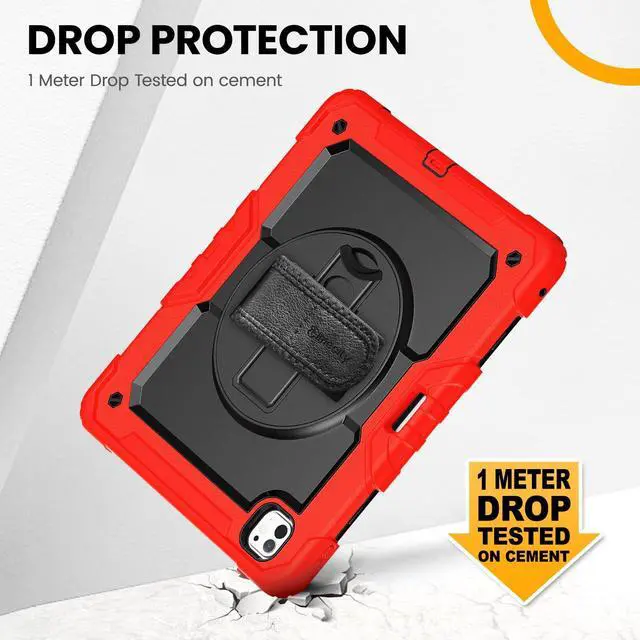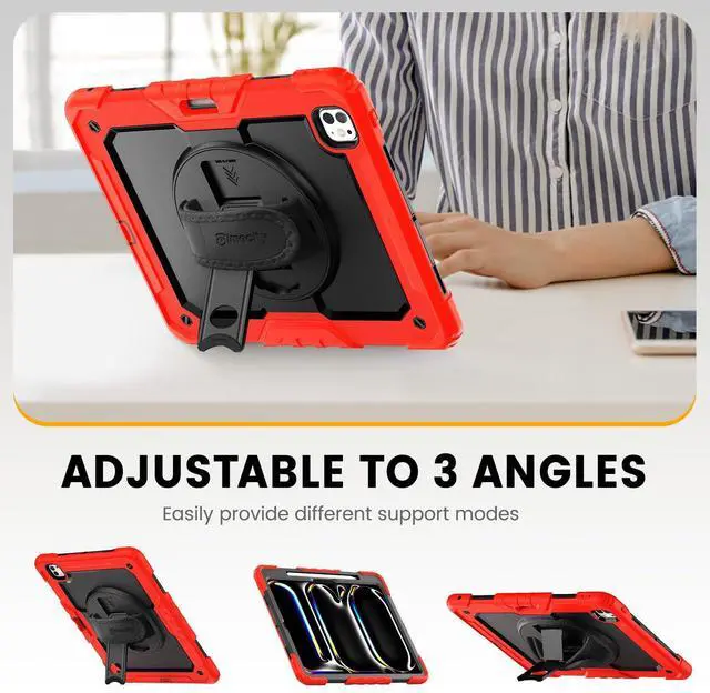 MULTI-ANGLE FUNCTIONALITY: 360° rotating stand with 5 positions for video calls, notes, or viewing; Detachable shoulder strap for commutes; Anti-slip hand strap secures during outdoor work; Dedicated pencil holder for hiking/transport