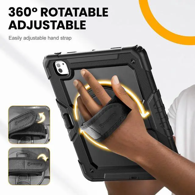 timecity for iPad Pro 13 Inch M4 Case 2024 7th Gen, 360° Rotating Stand, Pencil Holder & Wireless Charging, Shockproof with Screen Protector & Shoulder Strap - for Designers & Professionals, Black