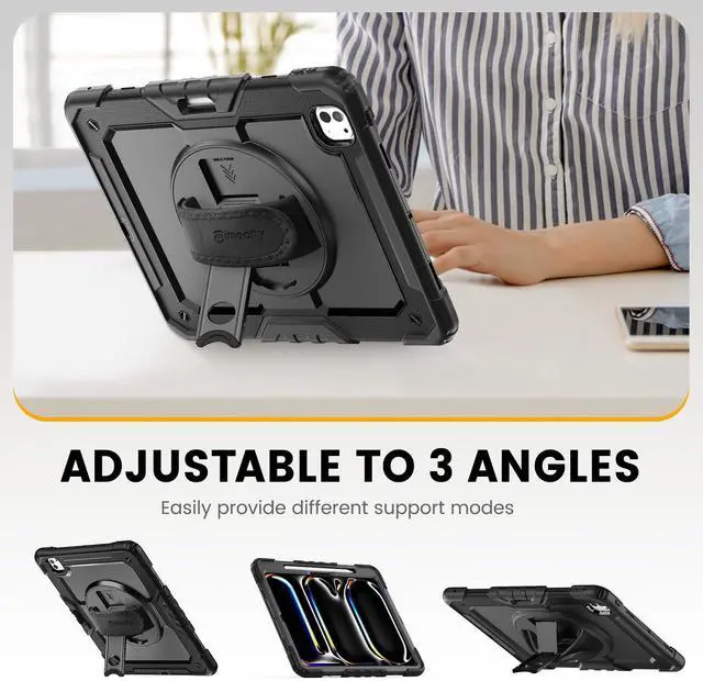 MULTI-ANGLE FUNCTIONALITY: 360° rotating stand with 5 positions for video calls, notes, or viewing; Detachable shoulder strap for commutes; Anti-slip hand strap secures during outdoor work; Dedicated pencil holder for hiking/transport