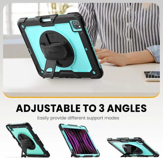 MULTI-ANGLE FUNCTIONALITY: 360° rotating stand with 5 positions for video calls, notes, or viewing; Detachable shoulder strap for commutes; Anti-slip hand strap secures during outdoor work; Dedicated pencil holder for hiking/transport