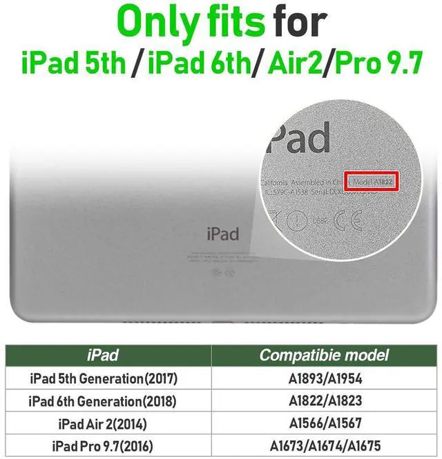 MODEL SPECIFICATIONS: Designed for iPad 6th Generation 9.7 inch 2018 ( A1893 / A1954 ), for iPad 5th Generation 9.7 inch 2017 ( A1822 / A1823 ), for iPad Air 2 ( A1566 / A1567 ) and fit for iPad Pro 9.7 inch ( A1673 / A1674 / A1675 ); Confirm compatibility under Settings > General > Model; Excludes iPad Air/Pro/Mini