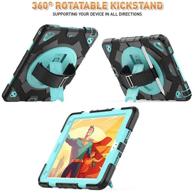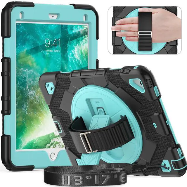 Timecity for iPad 6th / 5th Generation Case/iPad Air 2 / Pro 9.7 inch Case - Heavy Duty Protective Cover with Screen Protector, Stand, Shoulder Strap & Pencil Holder | Kids-Friendly - Light Blue