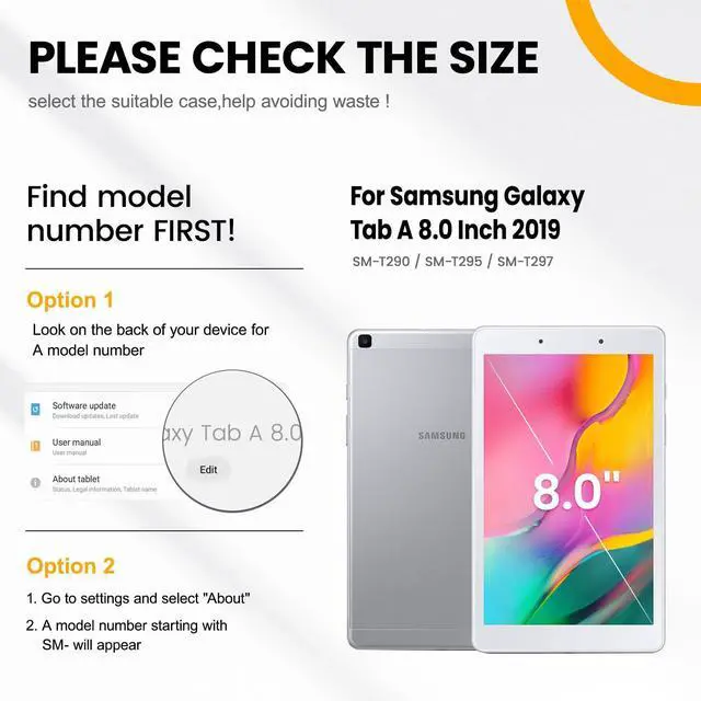 [Model Fits] Designed exclusively for Samsung Galaxy Tab A 8.0" 2019 Release (SM-T290/SM-T295/SM-T297) without S Pen. NOT compatible with any other models (NOT fit for Tab A8 2022 10.5'' X200/X205, NOT fit for Tab A 8.0 2018 T387 ). Please confirm the model before purchase. Go to "Settings" > "About" > "Model Number", you'll see the model number: SM-T290 or SM-T295 or SM-T297.