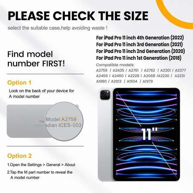 [Compatibility] This protective case is ONLY compatible with iPad Pro 11 inch 4th Generation 2022 (Models: A2759/ A2435/ A2761/ A2762), iPad Pro 11 inch 3rd Generation 2021 (Models: A2301/ A2377/ A2459/ A2460), iPad Pro 11 inch 2nd Generation 2020 (Models: A2228/ A2068/ A2230/ A2231) and iPad Pro 11 inch 1st Gen 2018 (Models: A1980/ A2013/ A1934/ A1979).[Model confirm] This case NOT fit for new iPad Pro 11 M4 2024 Version A2836, A3006.