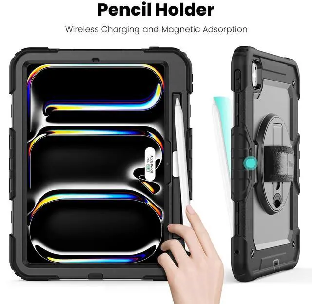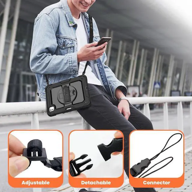MULTI-ANGLE FUNCTIONALITY: 360 rotating stand with 5 positions for video calls, notes, or viewing; Detachable shoulder strap for commutes; Anti-slip hand strap secures during outdoor work; Dedicated pencil holder for hiking/transport ^^