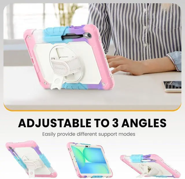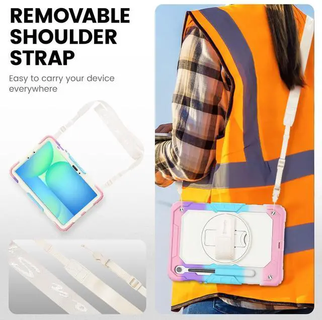 MULTI-ANGLE FUNCTIONALITY: 360 rotating stand with 5 positions for video calls, notes, or viewing; Detachable shoulder strap for commutes; Anti-slip hand strap secures during outdoor work; Dedicated S Pen holder for hiking/transport ^^